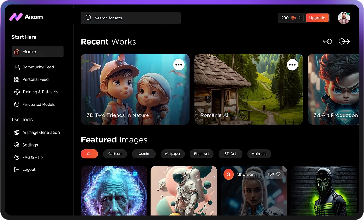Start with Aixom preset style options like cartoon, anime, and painting. But that’s just the beginning – express your creativity freely by describing any style in words or uploading reference images. From minimalist modern to vintage retro, dreamy watercolor to photorealistic, or even your favorite artist’s signature style – bring any style to life with Artguru’s flexible AI image generator.